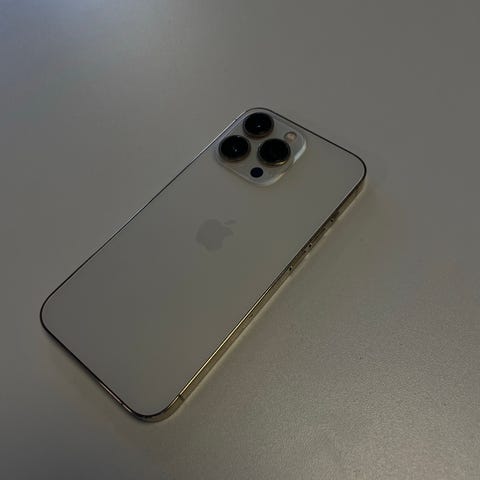 Renoveret iPhone 13 Pro i den flotte 'alpine green' farve sælges. Den har fået ny OLED 120Hz skærm, nyt batteri og ny ørehøjttaler. Så den fremstår i nærmest ny stand, undtagen siderne, der har brugsspor.