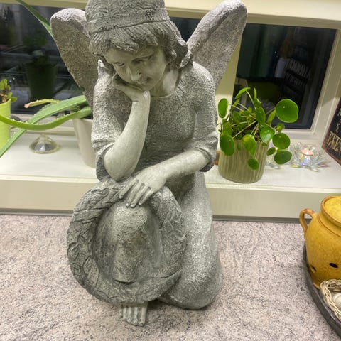Engel figur skulptur i cremefarvet materiale. Forestiller en siddende engel med vinger på en kugle med dekoreret bånd og firkantet sokkel. Velegnet som dekoration i hjemmet eller eventuelt i vinterhave eller udestue. Materialet er keramik.