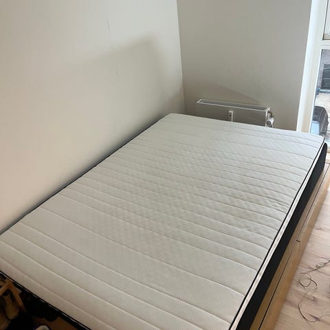 Jysk boks madras med sort betræk. Sengen står på ben, som giver luft under sengen og mulighed for rengøring. Neutral, enkel stil der passer ind i de fleste soveværelser eller gæsteværelser. Velegnet som fast soveplads eller som ekstra seng. Størrelse 140cm x200cm. Seng afhentes på adressen