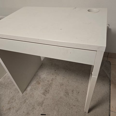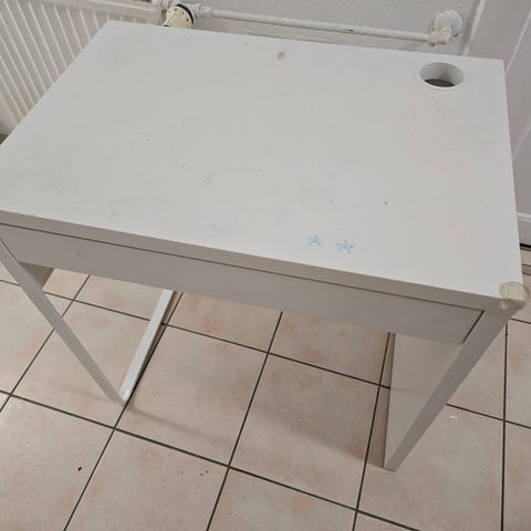 Der er et par farvede pletter og klistermærker på bordet. Men du får også en fin stor computermåtte gratis, så farvepletterne og ridserne på toppen kan dækkes.