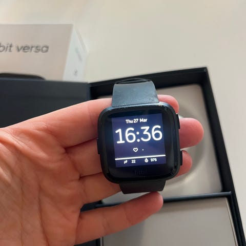 Fitbit Versa 4 smartwatch i sort med silikonerem - med æske og oplader.