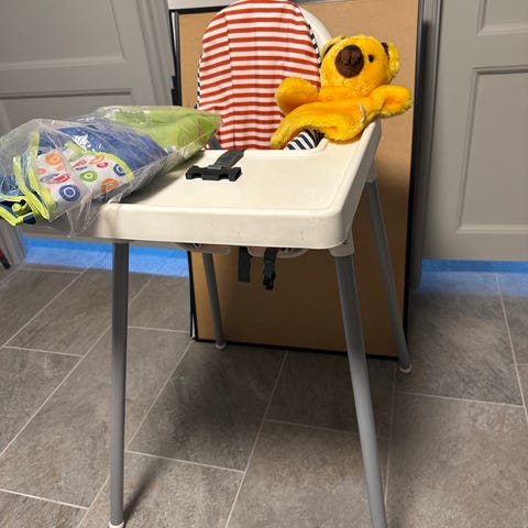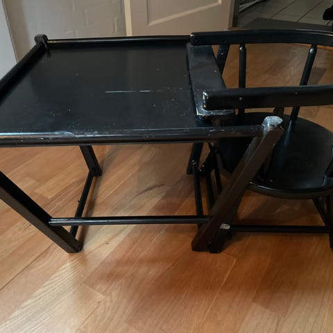 højstol med bakke. Højstolen er udført i træ med sort stel og hvid plastbakke. Den har integreret spisebakke med udskæring til barnet og høj rygstøtte. Velegnet som siddeplads ved spisebordet til mindre børn, der har brug for støtte og en stabil stol under måltider.