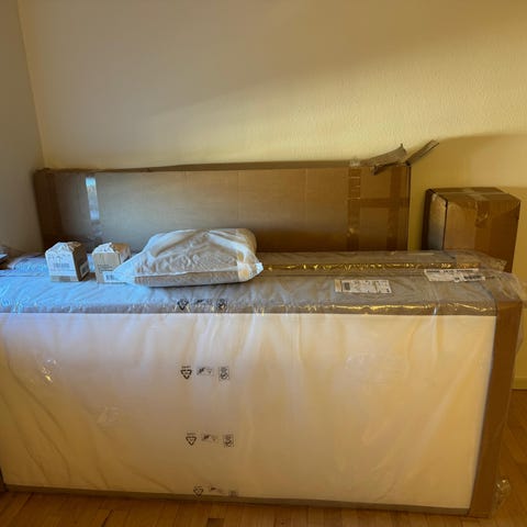 Måler 180 x 200 i alt, men boksmadresserne er to-delt så de hver måler 90 x 200.