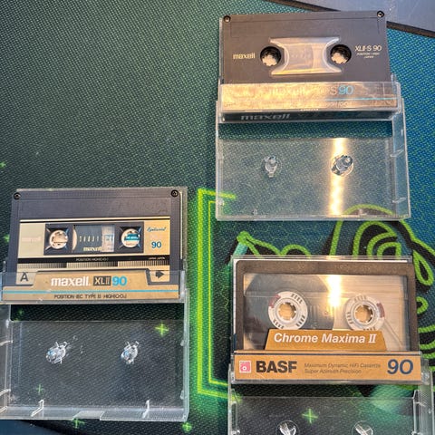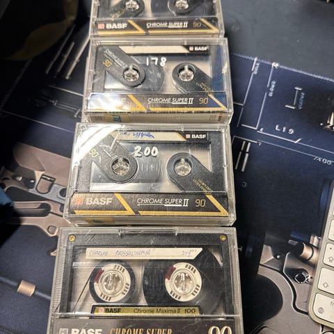 BASF magnetbånd samling af lydspolebånd til båndoptager. Flere æsker med forskellige typer BASF magnetbånd, herunder ældre røde og nyere sorte serier.