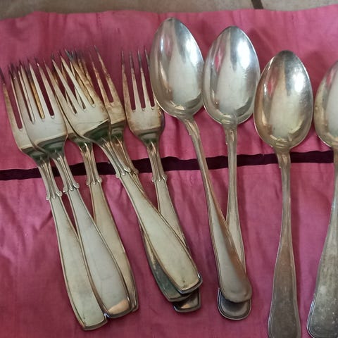 Sølvtøj, Dessertske, ABSA, 2 stk ABSA sølvplet dessertskeer. 17 cm lange og mønstret er gennembrudt med spisende næbfugle. Med lettere brugsspor.