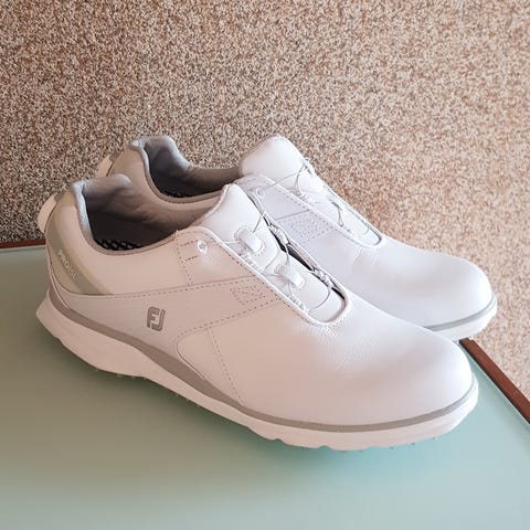 Nye og Ubrugte Vintage Kongeblå Golfsko. Produceret i England. Dame Model. Frynser henover snørebåndene. Ternet sål. Metal pigge under bunden.