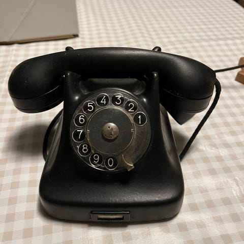Klassisk bordtelefon med drejeskive med tal og bogstaver samt original telefonrør og spiralledning.
