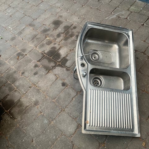 Rustfri stålvask bordplade med integreret køkkenvask og armatur. Lang, sammenhængende bordplade i rustfrit stål med udskæring til vask, egnet til montering i køkken, bryggers eller værksted. Overfladen er glat og rengøringsvenlig, og stålkonstruktionen gør bordpladen velegnet til områder med fugt og hyppig rengøring. Kan anvendes som arbejdsbord og afsætningsplads omkring vasken.