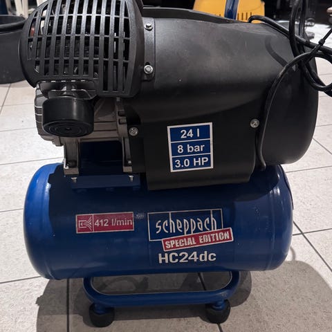 Scheppach SBL kompressor med 3,0 hk motor. Kompressoren har liggende, blå tryktank og er udstyret med hjul og håndtag for lettere transport. Enheden har beskyttelseskappe over motor og kompressorhoved samt manometer og tilslutning foran. Egnet til trykluftværktøj, oppumpning og andre almindelige trykluftopgaver i værksted eller garage.