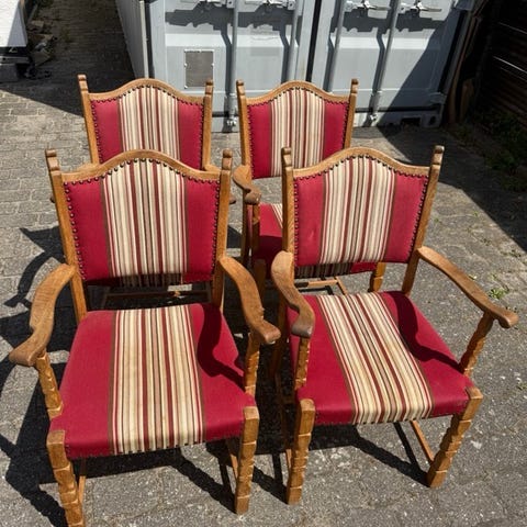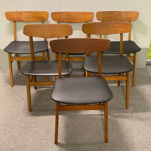 Farstrup. 4 lækker retro spisebordsstole i egetræ og taektræ. Er ombetrukket med skai i sort. Fremstår i pæn stand. Evt kan lev aftales. Pris er pr stol.