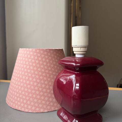 Vintage Keramisk bordlampe med håndmalede detaljer samt skræddersyet lampeskærm med blå og hvide striber. Lampen giver et hyggeligt lys. Kommer med ny el, ledning/stik samt ny skærm. Mål: H: 36 cm., W: 26 cm.