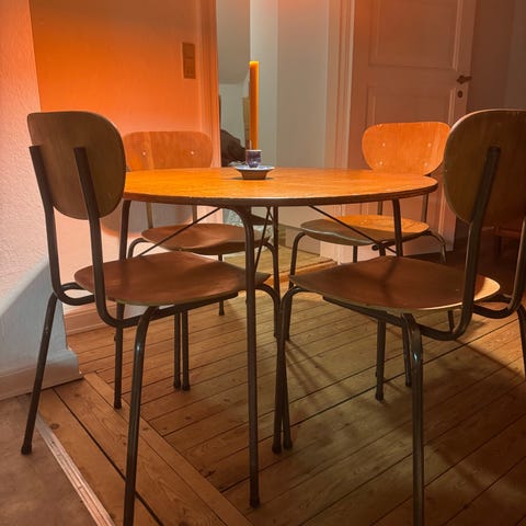 Stolene fejler ikke noget, men trænger nok til at blive vasket ned og malet da de har stået i huset under renovering, så der er lidt spartelpletter og malerprøver på dem.