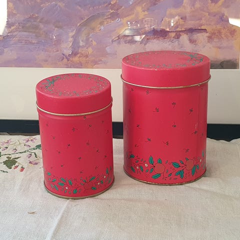 Vintage påskeblikdåse med kaninfamilie og påskeæg