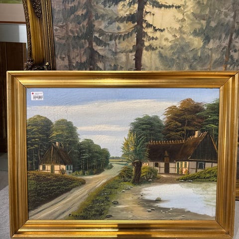 Maleri med naturmotiv, indrammet i en gylden ramme. Pastelfarver.,Afhentes i:,Røde Kors Kolding (621),Bemærk at mail, chat og beskeder ikke besvares, og varen skal købes på knappen "Gå til varen"