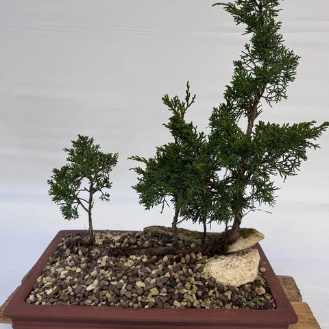 Tilbudt er et forfinet Juniper bonsai (Juniperus sp.), præsenteret i en elegant mame-størrelse-komposition med stærk karakter og et særligt naturligt udseende.