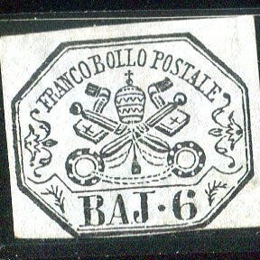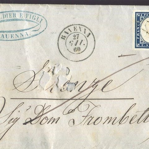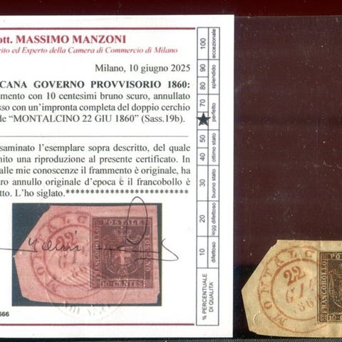Brevet fra Bagnorea – annulleringspunkter 6-a Toscanella affrannet på forsiden med 2 eksemplarer 1/2 baj på håndlaget papir. I transit: Viterbo-stempel 1. november 57 med måneden «omvendt». Friskt sammen. Underskrifter A. Diena, L. Gazzi og S. Palermo. Katalogværdi € 2720,00.