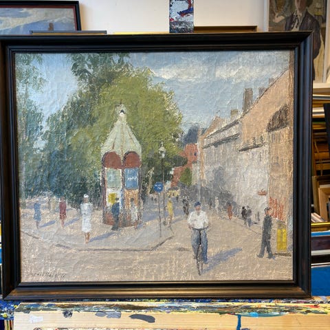 Oliemaleri af Giacinto Mondaini, Italien, fra det 20. århundrede, der forestiller et hjørne af en park med en person. Udstyret med en træramme med beskyttelsesglas.