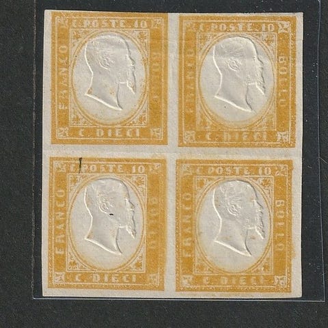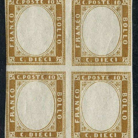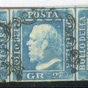 Stribe af 3 af 2 grana, 2. plade Napoli-papir i den sjældne farve „Azzurro vivo“ og plattet ved positionerne 41-43. Sammen meget sjælden, frisk, med lette, ideelle annuller og i god stand som attestet af certifikatet udstedt af Dr. M. Manzoni. Katalogpris € 10.000,00.