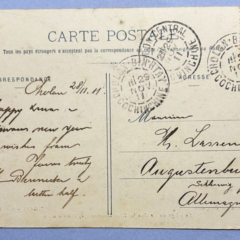 de 98 postkort om Indokina, med få frimærker og få skrevne beskeder
