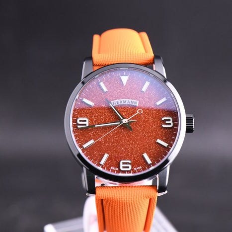 Dyk ned i elegance med dette sjældne ur, HERMANN, der præsenterer en smuk urskive i grøn aventurin. Dette materiale glitrer i lyset som en stjerneklar himmel og tilbyder enestående visuel dybde.