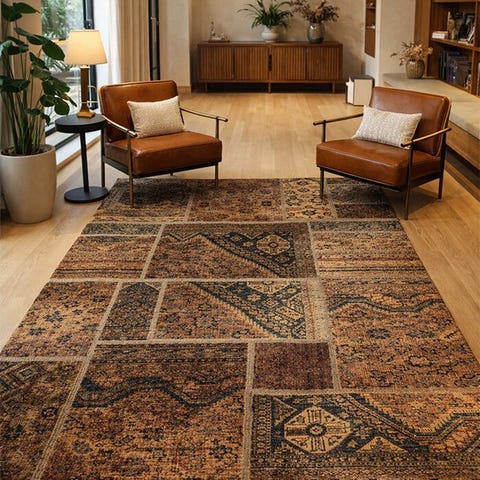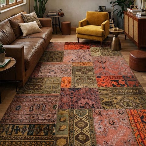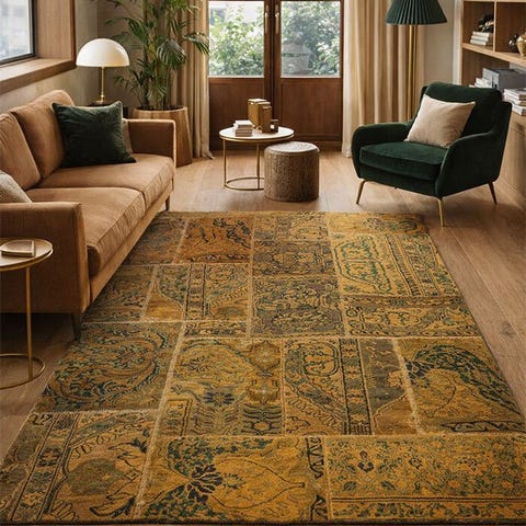 Uldtæppe bestående af håndknudede og genbrugte tæppestykker. Det bevarer de originale mønstre under sit nye udseende og farvetone.