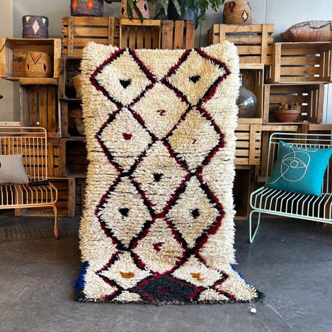 Dette stykke har en naturlig elfenbensfarvet uldbase beriget med en dynamisk zigzag- og diaman-komposition i rød, sort, grøn, blå og subtile flerfarvede accenter. Den lodrette rytme i mønsteret skaber bevægelse og dybde, samtidig med at den rå og grafiske identitet, der er typisk for Beni Ouarain-tæpper, bevares.