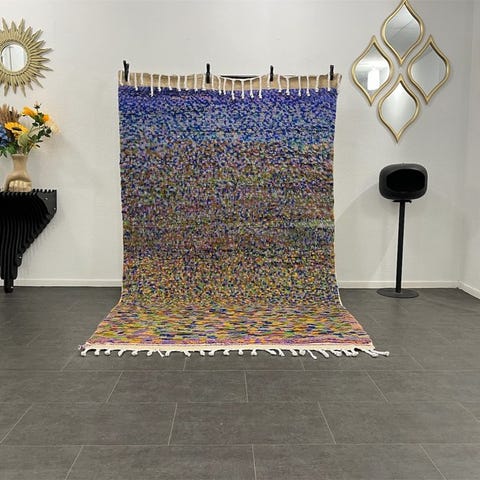 Dette vintage marokkanske Azilal-tæppe er et ægte berberløber, vævet i hånden i Høje Atlas-bjergene i Marokko. Skabt af berberkvinder ved hjælp af traditionelle teknikker, afspejler dette stykke den udtryksfulde og symbolske kunst, der er karakteristisk for Azilal-tæpper.