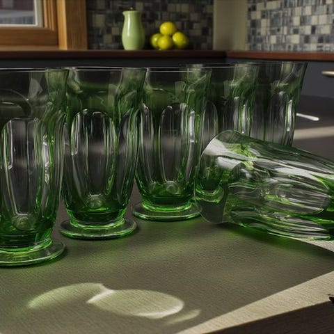 Sæt med 5 krystalklar, blyfri vandglas i smaragdgrøn, skabt af de bedste glasblæsere og skærere i verden fra Moser med det ikoniske mønster 'Lady Hamilton', lavet i 1934, en af virksomhedens største designklassikere (ikke signeret). Gennemsigtige paneler, skåret, flade kanter uden finish, sekskantet stang og rund fod. Moser's Lady Hamilton-kollektion er en verdensberømt serie: elegant og afbalanceret. Opstået i 1934, inspireret af Emma Hamilton, hustru til den britiske diplomat William Hamilton og formodet elskerinde til admiralen Horatio Nelson. Dette vintage sæt blev produceret i Tjekkiet i 1950'erne. Mål: højde 17,5 x diameter 9,7 cm.