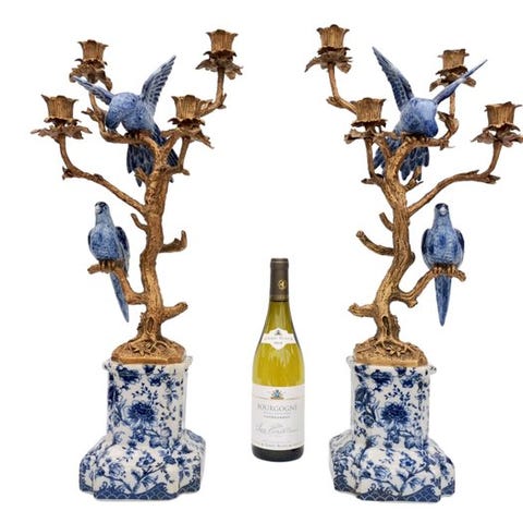 Det drejer sig om et par bronzebrudte bordlamper i form af to papegøjer. Disse er perfekte til borddekorationen ved en middag! Dimensionerne på disse lamper er som følger (+/-):