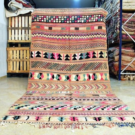 Ægte Beni Mguild-tæppe, håndvævet i det marokkanske Middle Atlas. Med dimensionerne 303 × 184 cm skiller dette unikke stykke sig ud med sin dybe jordfarve, der er et resultat af en naturlig udvikling af den oprindelige lilafarvede nuance, karakteristisk for gamle Beni Mguild-tæpper. Fremstillet af høj kvalitet naturlig uld, har det en tæt og varm tekstur. I perfekt stand kombinerer dette tæppe ægthed, karakter og tidløs elegance og passer lige godt ind i et moderne, boheme- eller minimalistisk interiør.