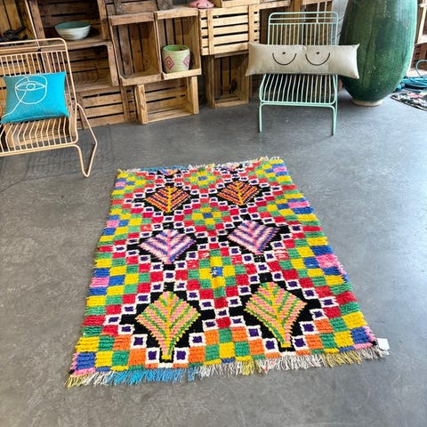 Autentisk vintage marokkansk Boucherouite-tæppe, håndvævet i Marokko ved hjælp af traditionelle Berber-teknikker. Boucherouite-tæpper er kendt for deres kunstneriske frihed, udtryksfulde farvekombinationer og unikke upcyklede materialer, hvilket gør hvert stykke til et unikt tekstilt kunstværk.