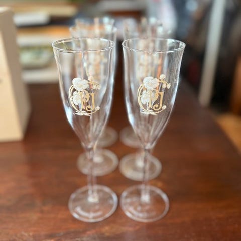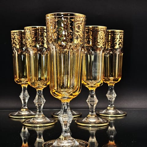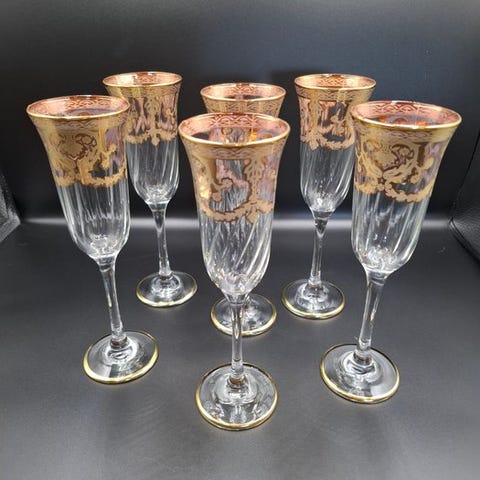 Raffinerede champagneglas (6) i ren tynd bohemisk krystal, slebet og dekoreret med 24 kt guld.