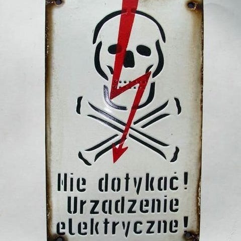Produceret mellem 1960'erne og 1980'erne blev skilte som dette opsat ved elektriske understationer, kraftrum, fabrikker og industrielle anlæg, hvor eksponering for strømførende udstyr udgjorde en alvorlig og øjeblikkelig trussel. Den fedtede, sorte skrift og den iøjnefaldende røde lynbolt var designet til at kommunikere fare øjeblikkeligt,