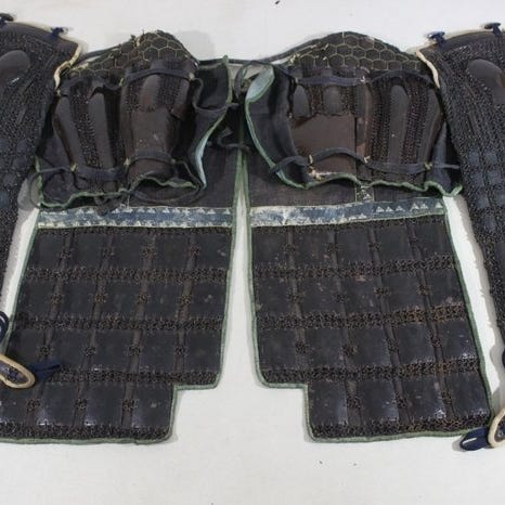 Et smedet jern Sangu-sæt fra Edo-perioden fra Japan med sort lakering, Kote 64 × 17 cm, Haidate 62 × 54 cm, Suneate 30 × 32 cm, samlet vægt 2,19 kg, i rimelig stand med let lakafskalning, ældre end 200 år (anslået periode E1-740). Klik på den blå "gå til varen" knap, for at købe eller byde på denne vare. Den samlede pris vil blive vist inden du afgiver dit bud.