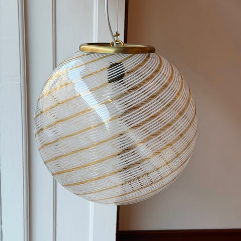 Vintage golden clear Murano ceiling lamp, Handmade in Italy circa 1970s. Good vintage condition, D35 cm. The lamp creates a beautiful play of light and shadows in any room due to its transparent glass and beautiful unique swirl pattern. Comes with a brass canopy and an adjustable mounting/wire. Please note that the handmade Murano glass can have small imperfections and unique characteristics, e.g. air bubbles or variations in patterns and shapes etc.