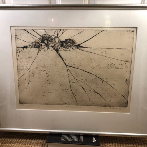 Maleri i ramme med motiv af et træ i et grønt landskab. Billedet er i en ældre træramme. Signeret Åse Riisager, mens der står MAI til venstre.