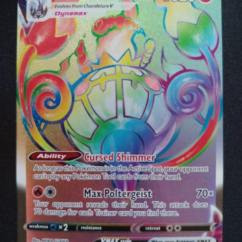 Pokémon Chandelure VMAX samlekort i japansk udgave. Kortet viser Chandelure i VMAX-form med 320 HP og japansk tekst. Velegnet til samling eller som del af et Pokémon TCG-dæk for spillere, der bruger japanske kort. Leveres i plastlomme som beskyttelse.
