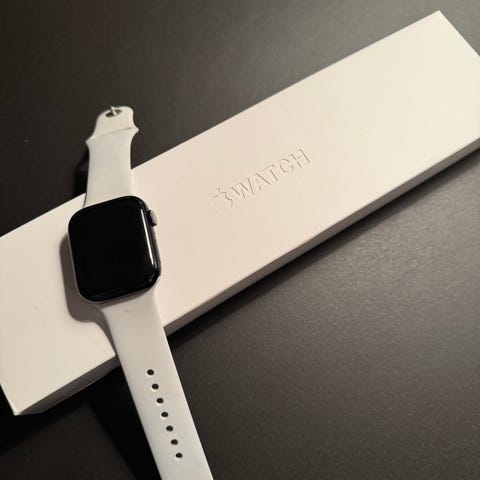 Apple Watch Series 8 smartwatch med 41 mm urkasse. I god stand, har blå silikonerem og panzerglas fra Elgiganten på. Har været passet godt på