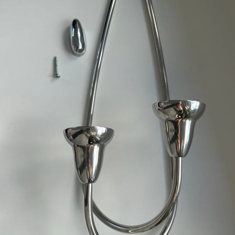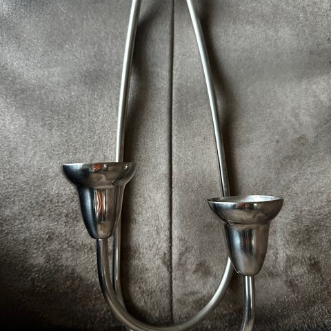 Georg Jensen væglysestage i metal. Vægmonteret lysestage med plads til to stearinlys. Udført i metal med tilhørende vægbeslag og skrue, som ses på billederne. Ubrugt, måske hængt op, haft stearinlys i en enkelt gang, men bærer ikke spor af brug.