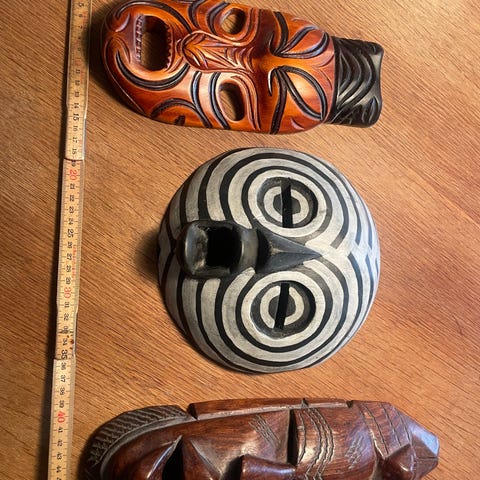 Sæt med udskårne træmasker til vægdekoration. Maskerne er udført i massivt træ i forskellige brune nuancer med udskårne ansigter og detaljer. Velegnet som dekorative vægophæng i stue, gang eller andre rum, hvor man ønsker et kunstnerisk og håndværkspræget udtryk. Pris på de 4 stk -500