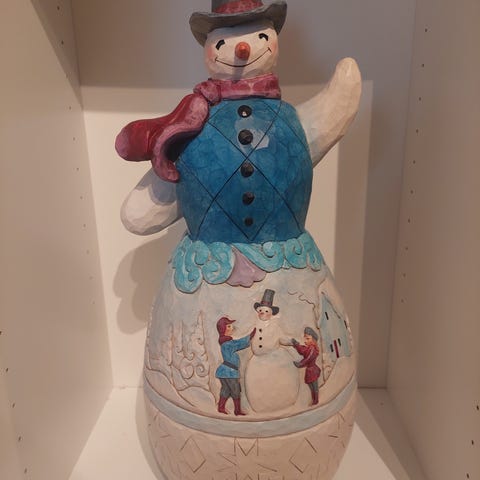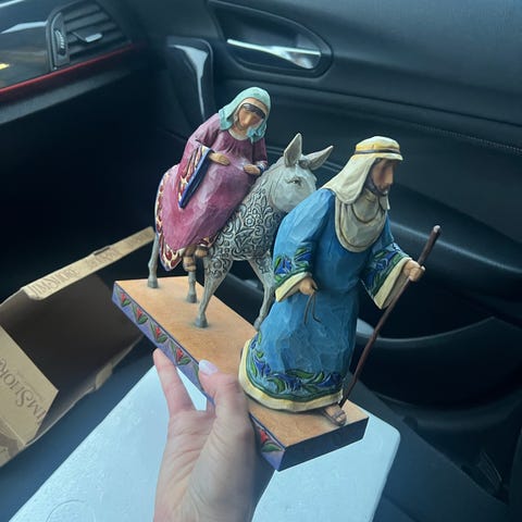 Jim Shore The Journey That Changed The World Figuren forestiller Josef gående foran et æsel med Maria ridende på ryggen. Håndmalet flerfarvet design med udskårne detaljer på tøj og æsel. Figuren står på en rektangulær fod med dekorerede kanter. Leveres i original Jim Shore-æske som vist på billederne.
