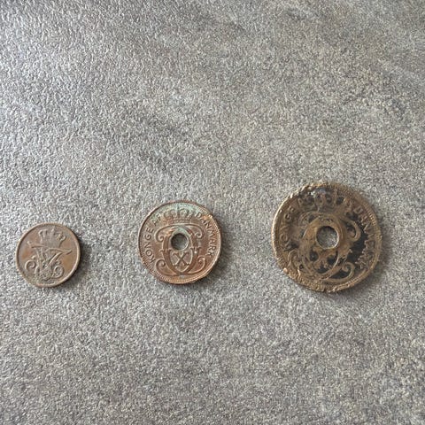 Blandet parti danske 5 øre mønter. Mønterne ligger løst i plastbøtte, og der kan forekomme både mørkpatinerede og mere blanke eksemplarer. Egner sig til samlere, dekoration eller hobbybrug. Antal, årgange og bevaringsgrad kan variere fra mønt til mønt.