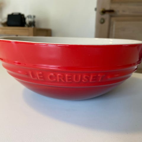 Le Creuset skål i keramik. Ydersiden er sort, mens indersiden er lys/cremefarvet. Skålen egner sig til servering, tilberedning eller som røreskål i køkkenet. Klassisk Le Creuset-stentøj, der kan bruges til hverdag og madlavning.