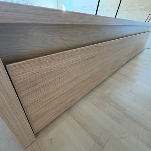 IKEA seng med opbevaringsskuffer i træ. Sengen har en træramme med lamelbund og integrerede skuffer under sengen til opbevaring. Skufferne har front i sort farve og udtræk, der giver ekstra plads til f.eks. sengetøj, tøj eller legetøj. Velegnet til soveværelse eller børneværelse, hvor der er behov for ekstra opbevaringsplads under sengen.