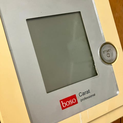 Apparatet betjenes med en tast, har stort display med tre værdier og en hukommelse til 30 værdier med visning af gennemsnitsværdien.