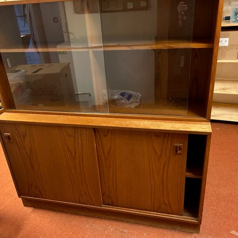 Skænk i teaktræ med skydelåger og skuffer. Møblet står på ben og har et rent, enkelt design. Indvendigt er der flere hylder samt skuffer, hvor nogle af skufferne har grøn indvendig belægning. Bagest i den ene sektion er der dekoreret spejlpanel. Skænken egner sig til opbevaring i stue, spisestue eller entré, fx til service, tekstiler eller andre husholdningsgenstande.