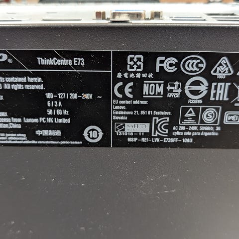 Stationær computer i tårn-kabinet fra Lenovos ThinkCentre E-serie. Modellen er E73, som typisk anvendes til kontor- og hjemmebrug. Kabinettet rummer standard ATX-strømforsyning og bundkort med plads til RAM-moduler og interne drev. Der er optisk drev i fronten samt flere tilslutningsmuligheder på bagsiden afhængigt af den konkrete konfiguration.