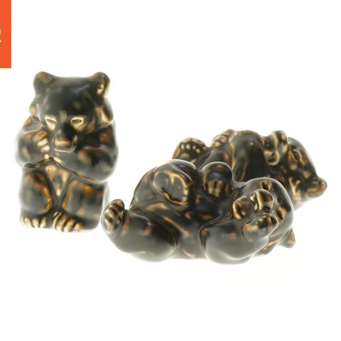 Denne figur viser to bjørne i en legende positur, fremstillet i hvid porcelæn. Størrelsen er 10,5x10 cm. På bunden ses et stempel med 'Royal Copenhagen Denmark'. Figuren har detaljerede udskæringer, der tydeligt viser bjørnenes ansigtstræk og kropsholdning. En klassisk dekorationsgenstand, der passer ind i forskellige indretningsstile.