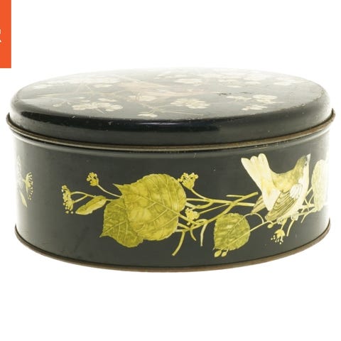 Rund dåse med fuglemotiv (str. Ø 23,5 cm højde 10,5 cm)