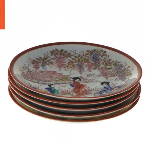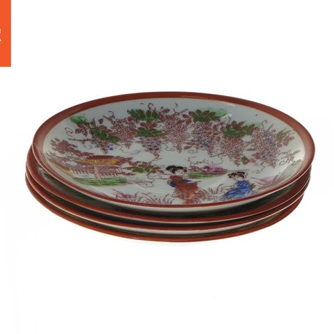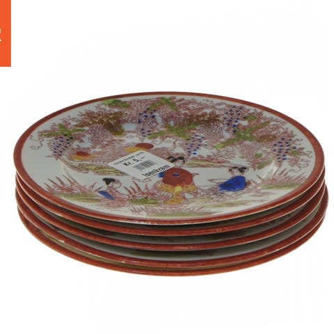 Dekorativ tallerken med asiatisk design, der viser traditionelle scener og figurer. Tallerkenen har en diameter på 13 cm og er farverig med motiver af mennesker og blomster. Bagsiden har et stempel med asiatiske tegn.